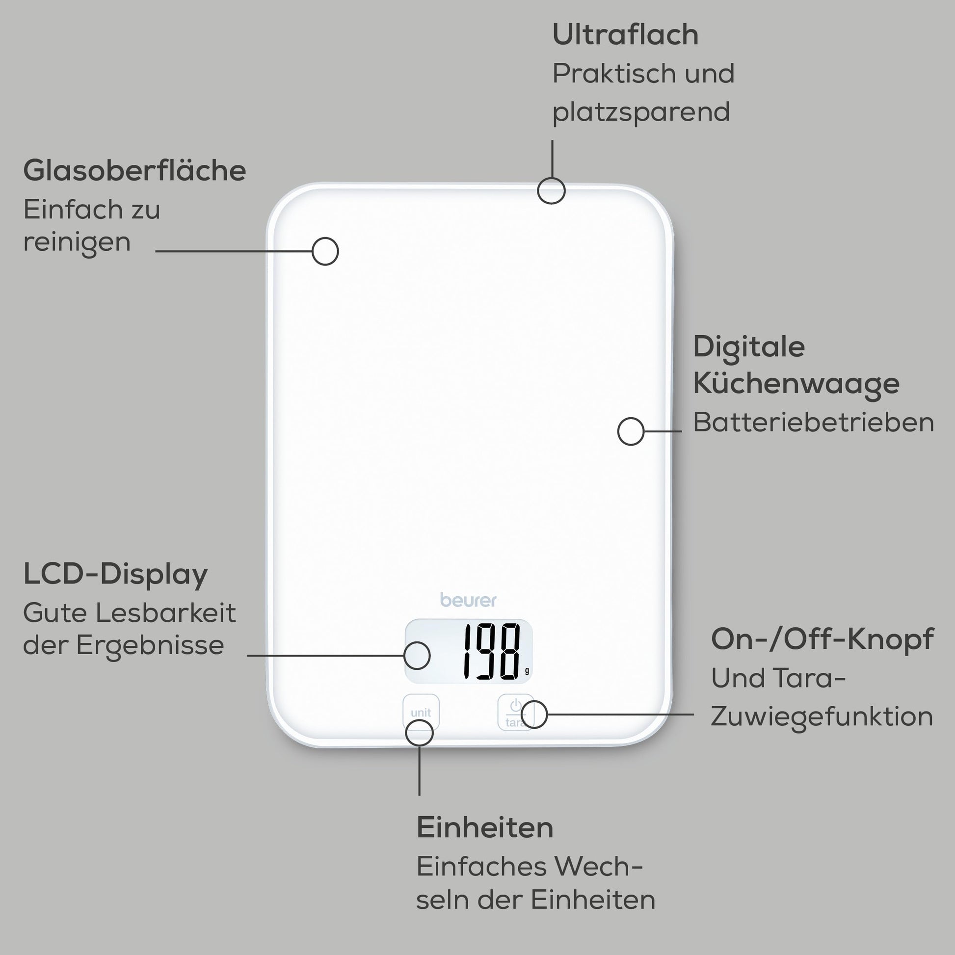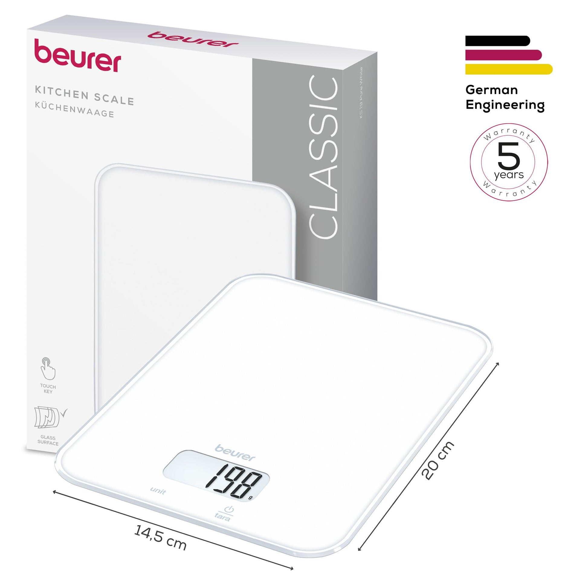 - DIGITALE WAAGE: Die Küchenwaage KS 19 Pure White von Beurer ist batteriebetrieben und besitzt ein LCD-Display – mit einer Garantie von 5 Jahren